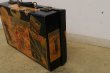 たくさんのステッカーが貼られたネイビーのトランク。古い三越のものです。