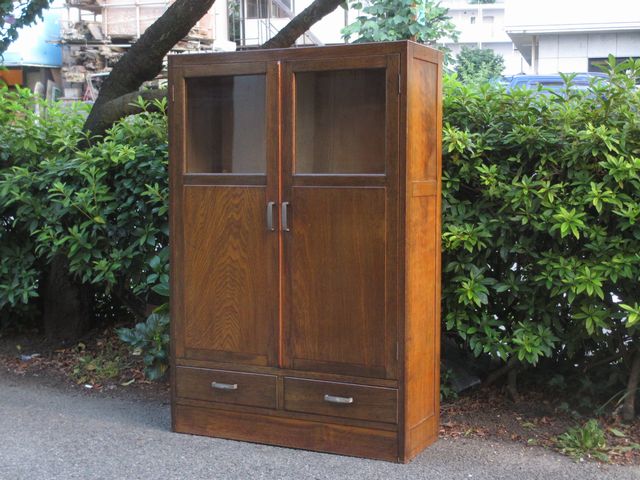 ヴィンテージ 木味良いガラス本箱 キャビネット 楢材