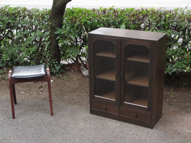 ホーム本棚・キャビネット昭和レトロ ラワン無垢材のガラス本箱 食器棚