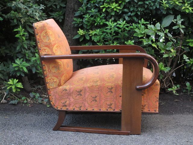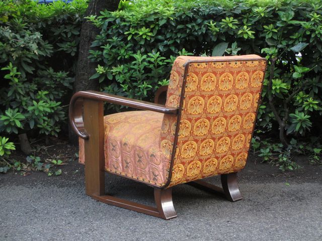 桜材フレームにオリエンタルな柄の布地が張られた一人掛けソファ。